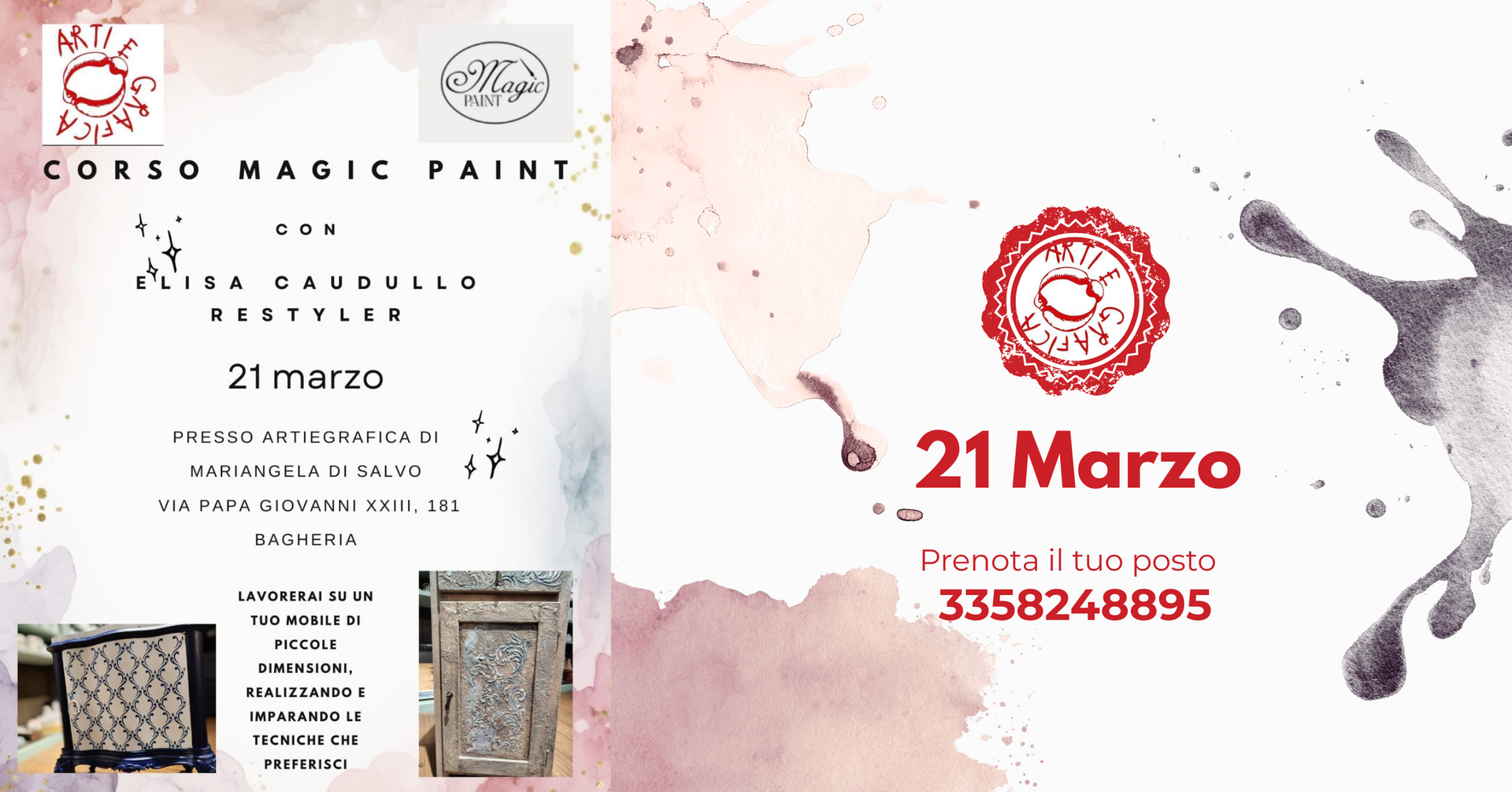 Restyling con Elisa Caudullo ed i prodotti Magic Paint. Imparerai su un tuo mobile da te scelto di dimensioni tali da essere facilmente trasportato, le principali tecniche che ti permettono di ridare nuova vita al mobile.