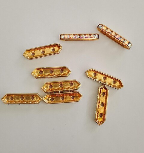 Eleva il design dei tuoi gioielli con l'inconfondibile brillantezza dei nostri divisori a tre fori. Questi esclusivi componenti per bigiotteria sono realizzati con autentici cristalli Swarovski, incastonati su una base dorata impreziosita da strass laterali che catturano la luce da ogni angolazione. Perfetti per chi cerca materiali di alta qualità per le proprie creazioni, questi connettori trasformano una semplice collana o un bracciale in un capolavoro di stile. La loro struttura a tre fori li rende ideali per realizzare gioielli fai da te complessi e multifilo, garantendo un risultato professionale e di grande impatto visivo. Aggiungi un tocco di lusso e raffinatezza ai tuoi progetti con questi magnifici accessori per gioielli.