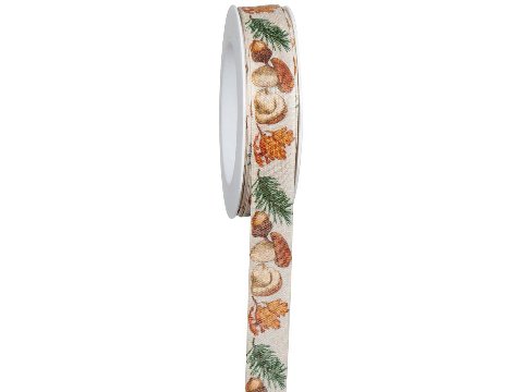 Nastro avorio con decori di funghi, foglie e ghiande Goldina 0,25 mm x 1 mt, perfetto per decorazioni e cucito creativo.