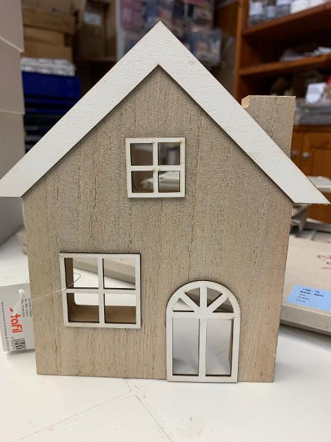 Colore legno naturale con cornice tetto di colore bianco e telai porte e finestre di colore bianco. Sul davanti una porta ad arco ed una finesta quadrata. In alto una finestra luce in posizione mansardata. Il profilo della casa, a due tetti spioventi, comprende anche una ciminiera da camino.